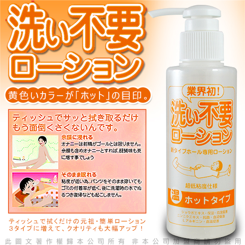 用完潤滑液和自慰套自爽後往往讓人想休息片刻(甚至想直接睡著)實在懶得再爬起身到浴室清洗擦拭。如果放任不去清洗往往會造成皮膚黏癢的衛生問題!現在您不用再煩惱這個問題了!超便利的免清洗潤滑液誕生囉!